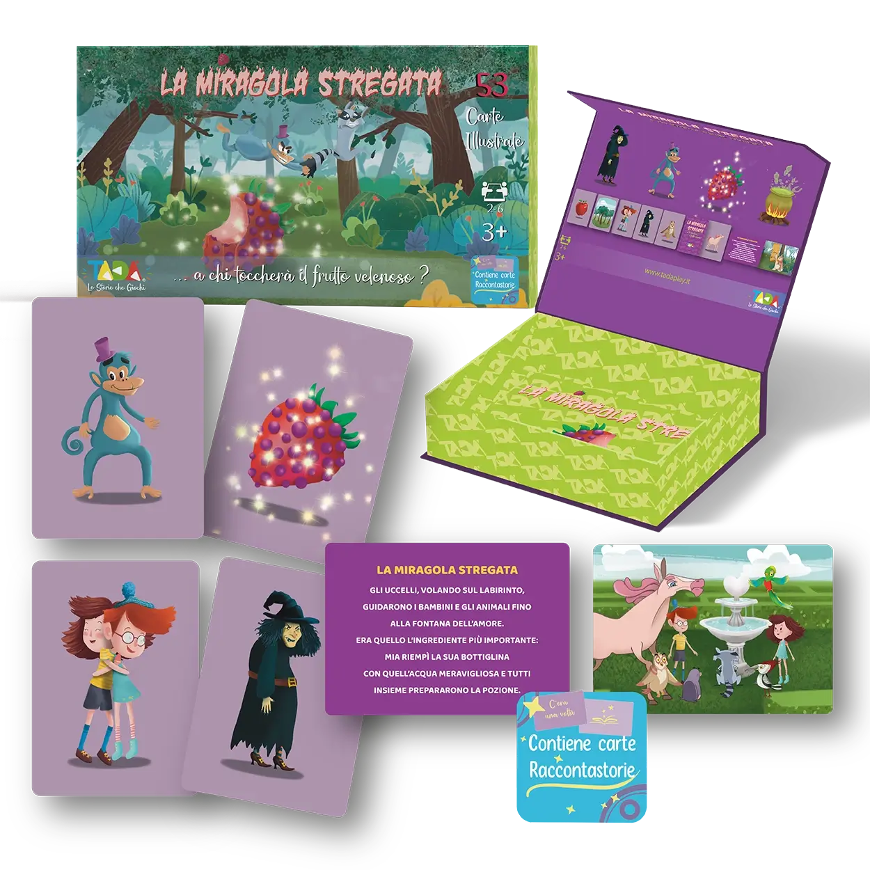 La Miragola Stregata stimola la comprensione di semplici regole ed il rispetto della turnazione. I giochi con le carte incoraggiano la socialità anche nei bambini più piccoli: più si è, più giocare sarà divertente!
