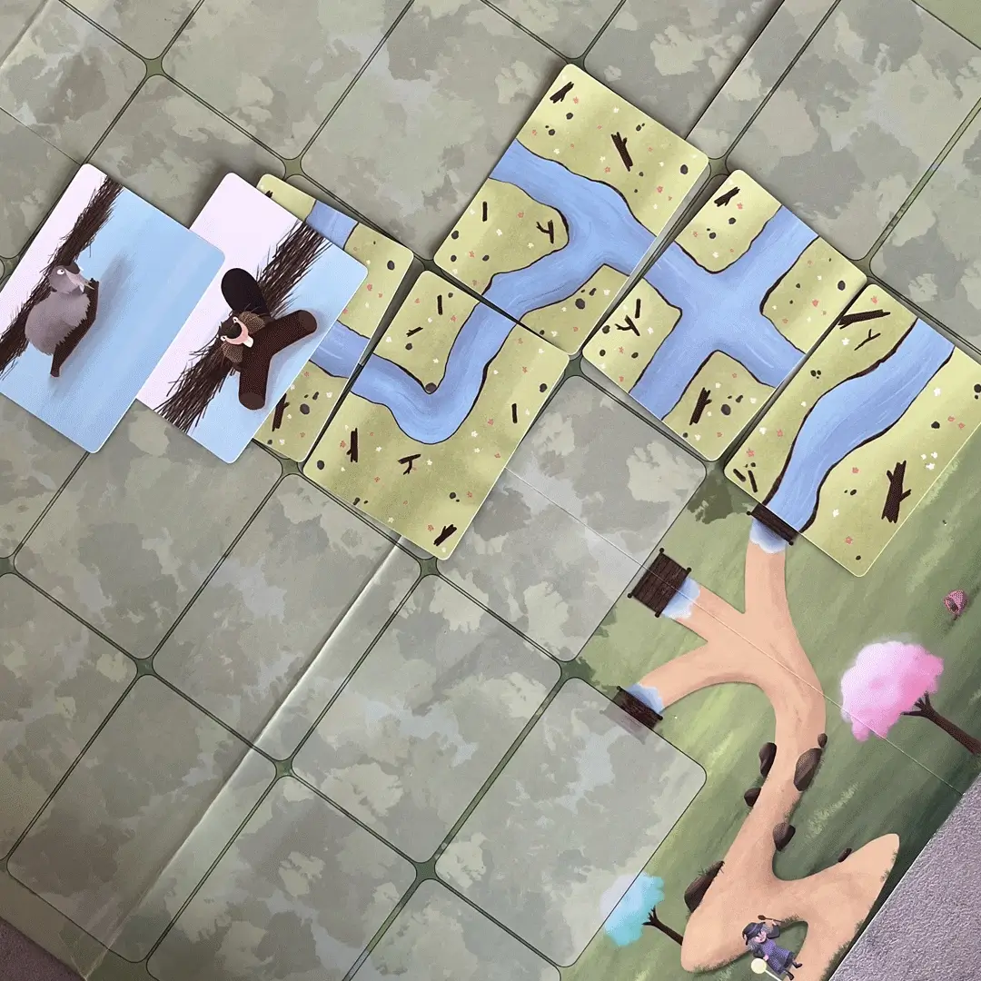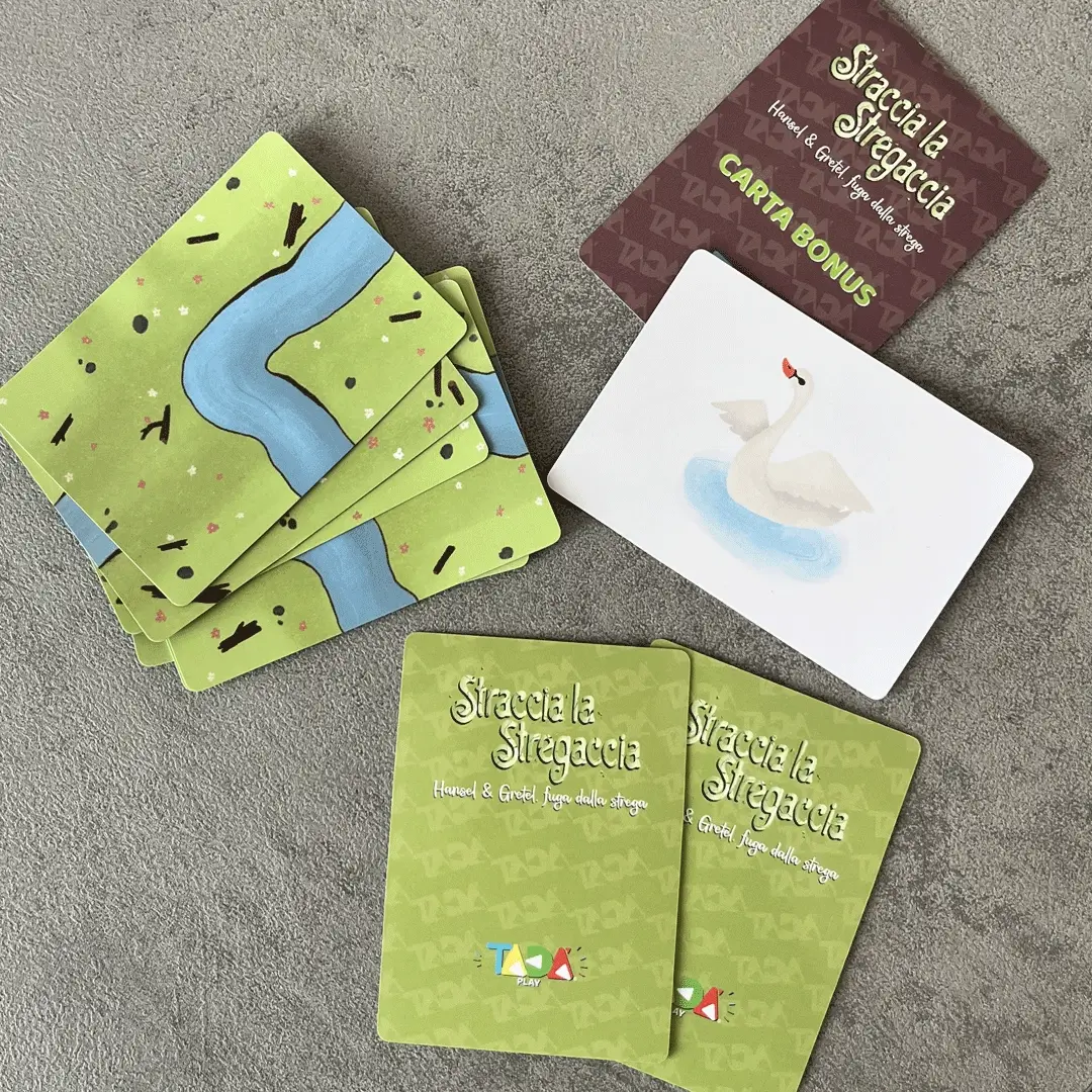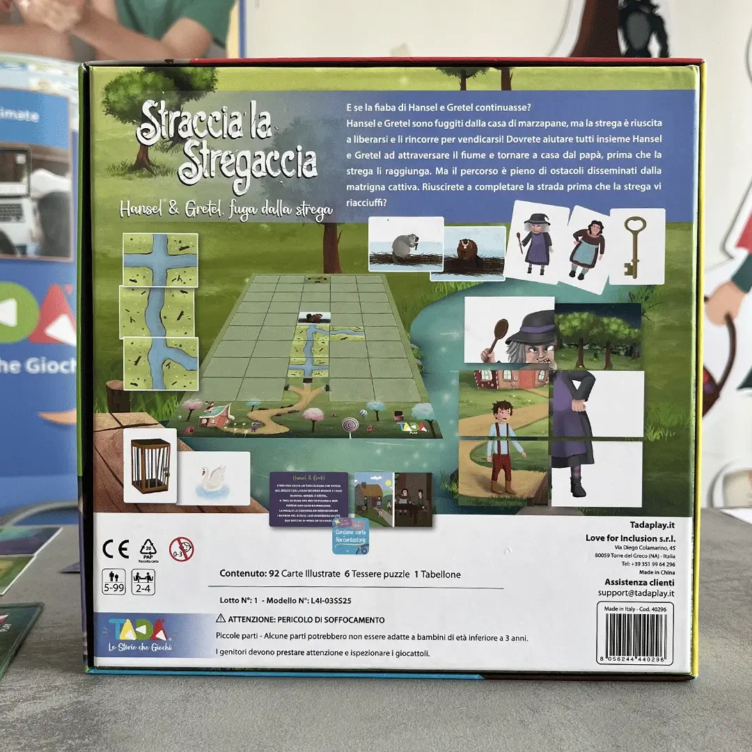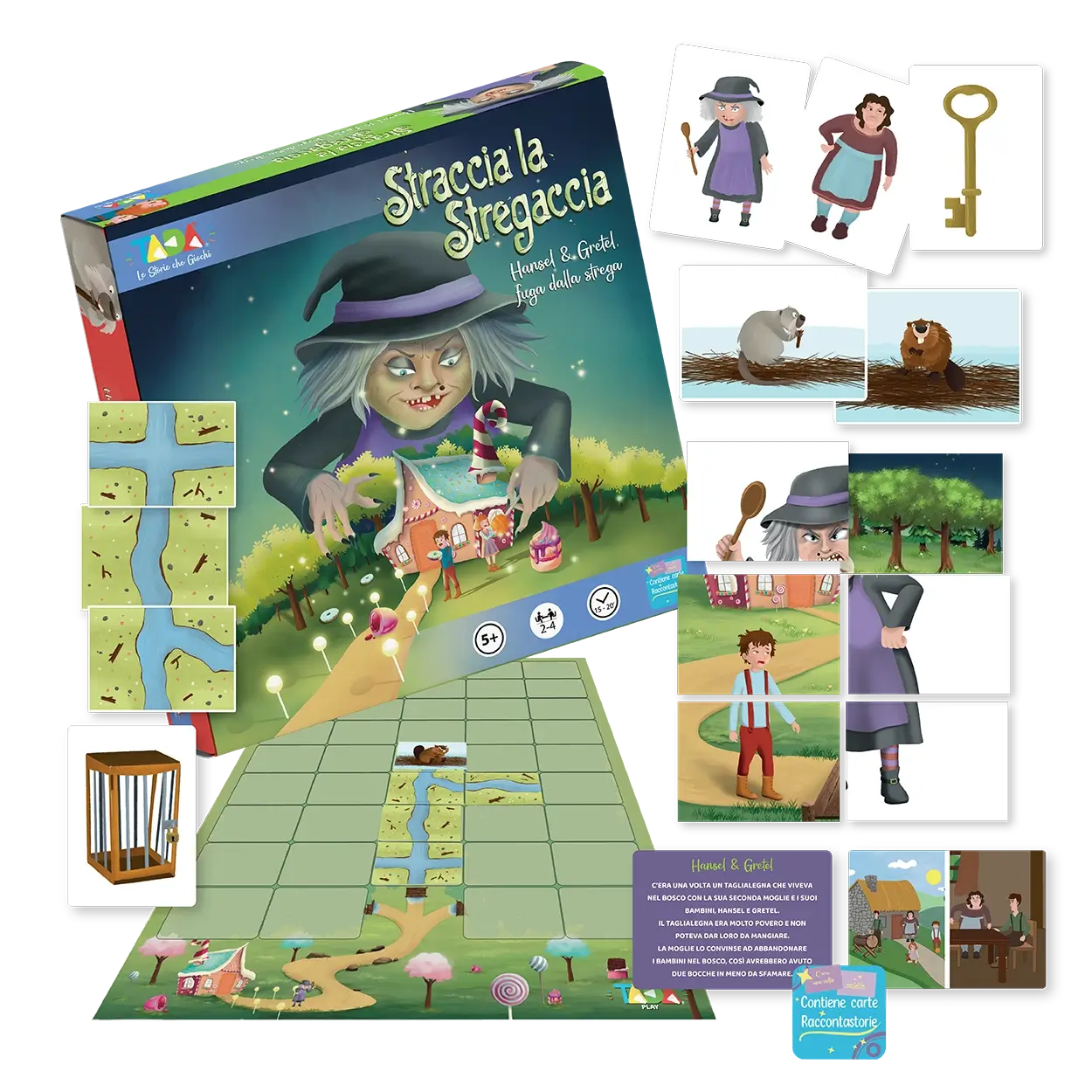 Dovremo collaborare tutti insieme per raggiungere la casa del papà, costruendo il percorso lungo il fiume. La matrigna ci ostacolerà e il castoro bloccherà il passaggio: dovremo quindi usare un po’ di strategia per posizionare le carte fiume ed usare saggiamente gli aiuti per proseguire. I giocatori vincono se arrivano alla casa del papà prima che il puzzle della strega sia completo, vince la STREGACCIA se il puzzle viene ricostruito prima della fine del percorso o non ci sono più strade disponibili. Un gioco molto adatto alla famiglia: dovremo consultarci ed aiutarci per far fronte agli imprevisti.